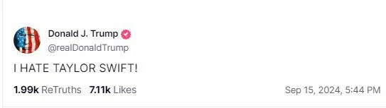 «Μισώ την Τέιλορ Σουίφτ!», έγραψε στο δίκτυό του Truth Social με κεφαλαία γράμματα ο πρώην πρόεδρος και υποψήφιος των Ρεπουμπλικάνων στις εκλογές της 5ης Νοεμβρίου.