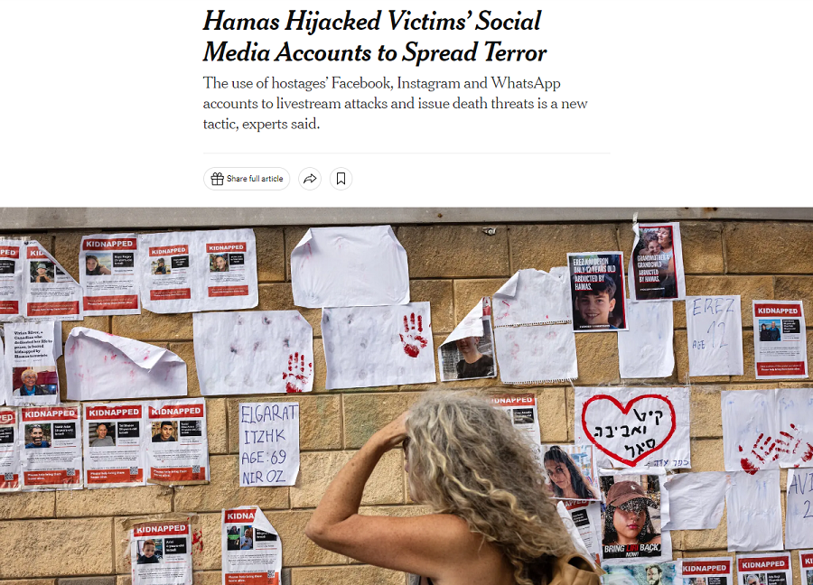 Η Χαμάς, σύμφωνα με τους New York Times που επικαλείται τις καταθέσεις ισραηλινών οικογενειών απαχθέντων αλλά και ειδικούς στα μέσα κοινωνικής δικτύωσης, χάκαρε τους λογαρισμούς στα social media των απαχθέντων ισραηλινών και τους χρησιμοποίησε για να μεταδώσει ζωντανά την επίθεση της 7ης Οκτωβρίου, βίαια μηνύματα και να διεξάγει ψυχολογικό πόλεμο.