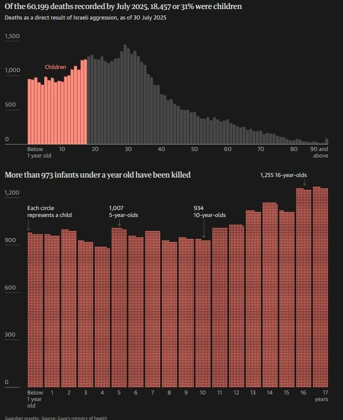 Στα τέλη Ιουλίου, ο κατάλογος των νεκρών στη Γάζα περιλάμβανε 60.199 ονόματα, εκ των οποίων τα 18.457 ήταν κάτω των 18 ετών.