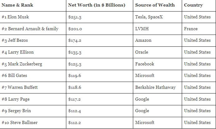1. Έλον Μασκ 2. Μπερναρ Αρνο 3. Τζεφ Μπέζος 4. Μπιλ Γκέιτς 5. Στηβ Μπάλμερ 6. Μαρκ Ζουκερμπεργκ 7. Λαρρυ Πέιτζ 8. Λάρρυ Έλλισον 9. Σεργκέι Μπριν 10. Γουόρεν Μπάφετ