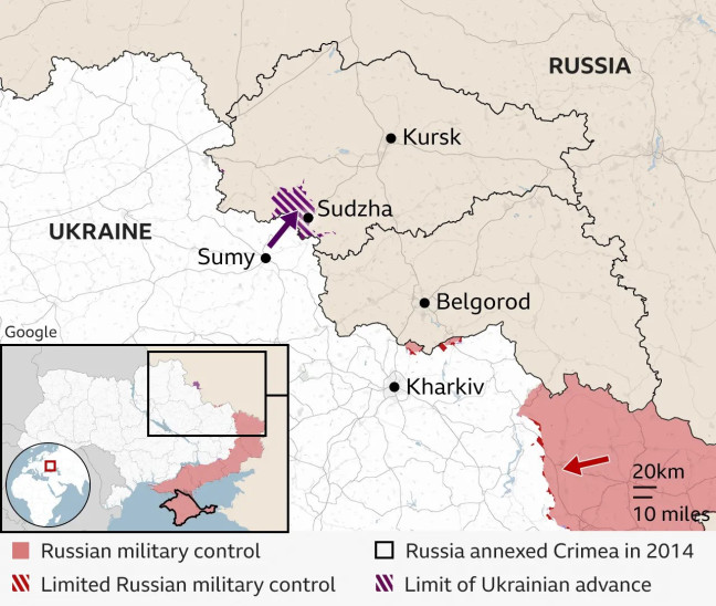 Ο τωρινός κυβερνήτης του Κούρσκ, Alexei Smirnov, ανέφερε ότι οι ουκρανικές δυνάμεις κατέλαβαν 28 κοινότητες, αλλά ο πρόεδρος της Ουκρανίας ανέβασε τον αριθμό σε 74.