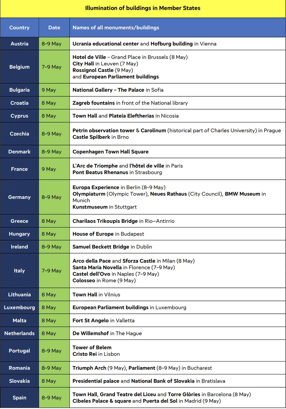 Στα κτίρια θα εμφανίζεται το σύνθημα της προεκλογικής εκστρατείας «Αξιοποίησε την ψήφο σου. Για να μην αποφασίσουν άλλοι για σένα» ή την σημαία της ΕΕ από την Τετάρτη 8 Μαΐου έως την Πέμπτη 9 Μαΐου.