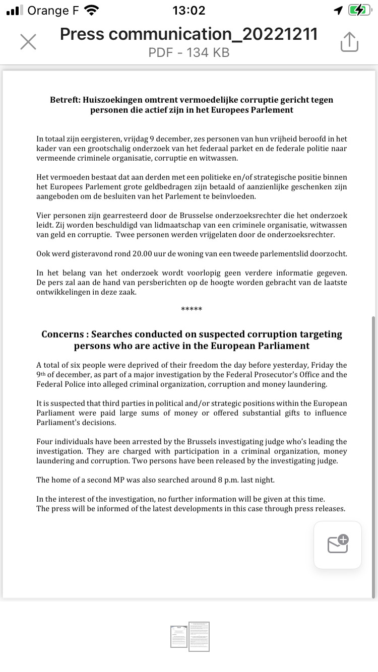 Στο δελτίο Τύπου σημειώνεται ακόμη ότι την Παρασκευή βρέθηκαν υπό κράτηση έξι άτομα, καθώς και ότι το βράδυ του Σαββάτου έγινε έφοδος στο σπίτι ενός δεύτερου ευρωβουλευτή.