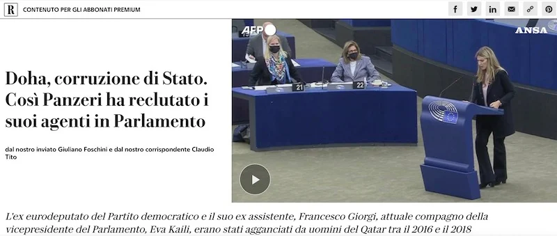 «Το Κατάρ έχει διαφθείρει την ευρωπαϊκή δημοκρατία. Και το έκανε μέσω τουλάχιστον δύο Ιταλών πρεσβευτών: του πρώην ευρωβουλευτή του Δημοκρατικού Κόμματος, Αντονιο Παντσέρι. Και ο πρώην βοηθός του, Φραντσέσκο Τζόρτζι, νυν σύντροφος της αντιπροέδρου του Κοινοβουλίου, Εύα Καϊλή. Αυτό προκύπτει από τις πράξεις που οδήγησαν στη σύλληψη των δύο, μαζί με άλλα τρία άτομα. Και ότι μέσα στα επόμενα εικοσιτετράωρα θα πρέπει να αξιολογηθούν για να αποφασιστεί αν θα αφεθούν ελεύθεροι ή θα τους συνοδεύσουν στη φυλακή.