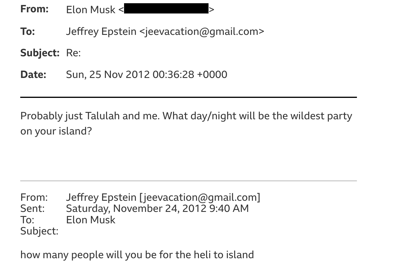 Τα έγγραφα περιλαμβάνουν αλληλογραφία μέσω ηλεκτρονικού ταχυδρομείου μεταξύ του Epstein και του δισεκατομμυριούχου τεχνολογίας Elon Musk σχετικά με ταξιδιωτικά σχέδια που ο Epstein φαινόταν να οργανώνει, αν και ο Musk έχει δηλώσει ότι δεν έχει επισκεφθεί ποτέ το ιδιωτικό νησί του Epstein.