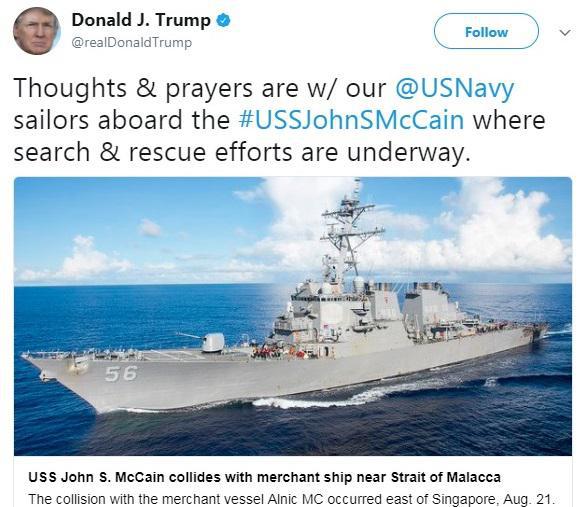 «Σύμφωνα με τις αρχικές πληροφορίες, το John S. McCain υπέστη ζημιά στην αριστερή μπροστινή του πλευρά», σημείωσε το αμερικανικό Πολεμικό Ναυτικό, τονίζοντας ότι το αντιτορπιλικό πλέει αυτόνομα και κατευθύνεται προς το λιμάνι, χωρίς να διευκρινίσει όμως ποιο.