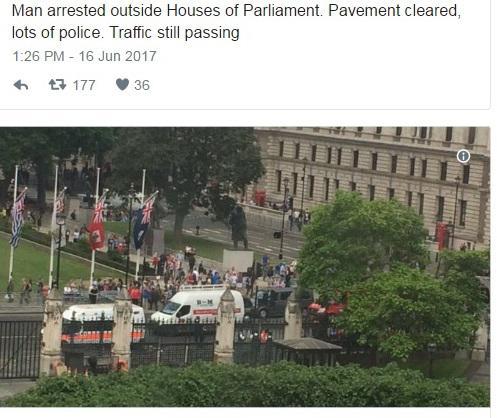 Η αστυνομία ανακοίνωσε ότι ένας άνδρας γύρω στα 30, οπλισμένος με μαχαίρι συνελήφθη μπροστά από το βρετανικό κοινοβούλιο και ότι δεν υπάρχουν τραυματίες.