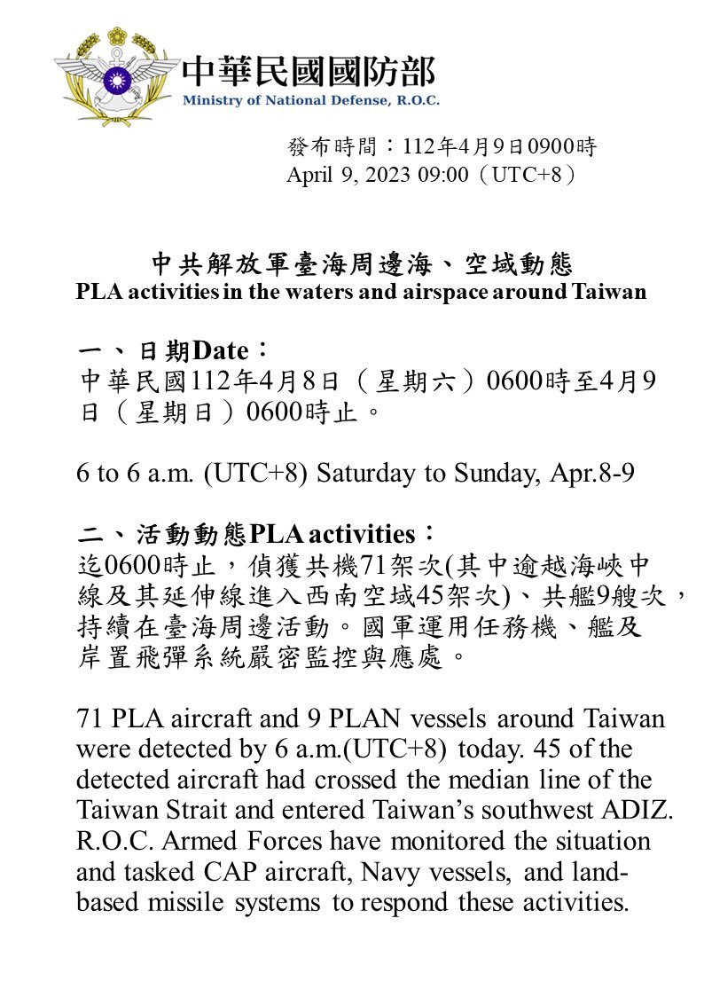 Ο Λαϊκός Απελευθερωτικός Στρατός της Κίνας (PLA) έστειλε 70 πολεμικά αεροσκάφη, συμπεριλαμβανομένων μαχητικών αεροσκαφών, αεροπλάνων αναγνώρισης και ανεφοδιασμού, στη ζώνη αναγνώρισης αεράμυνας της Ταϊβάν το πρωί της Κυριακής, όπως ανακοίνωσε το υπουργείο Άμυνας της Ταϊβάν. Σύμφωνα με την ανακοίνωση, 31 αεροπλάνα διέσχισαν τη μέση γραμμή – τα de facto σύνορα στα στενά της Ταϊβάν μεταξύ Ταϊβάν και Κίνας.