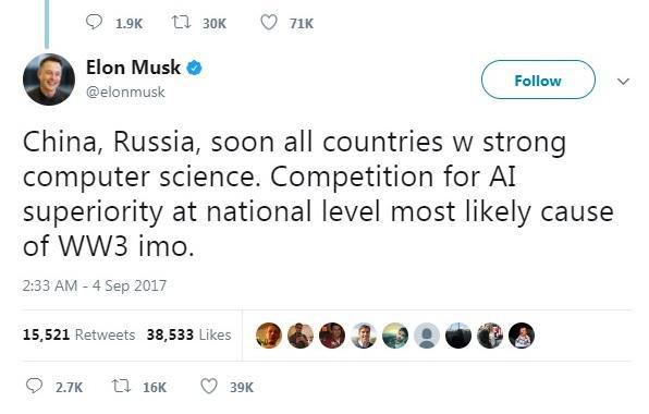 Σε «τιτίβισμά» του στο Twitter έγραψε ότι, καθώς η Κίνα, η Ρωσία και άλλες χώρες αποκτούν ολοένα ισχυρότερες δυνατότητες στο πεδίο των υπολογιστών, «ο ανταγωνισμός για το ποιός θα έχει την πιο ισχυρή τεχνητή νοημοσύνη σε εθνικό επίπεδο, πιθανόατα θα προκαλέσει ένα τρίτο παγκόσμιο πόλεμο».