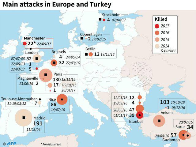 Οκτώ νεκροί είναι ο απολογισμός της επίθεσης και σχεδόν 50 τραυματίες. Οι δράστες, τους οποίους σκότωσαν αστυνομικοί, φορούν ψεύτικα γιλέκα με εκρηκτικά. Είκοσι τέσσερις ώρες μετά, το Ισλαμικό Κράτος αναλαμβάνει την ευθύνη.