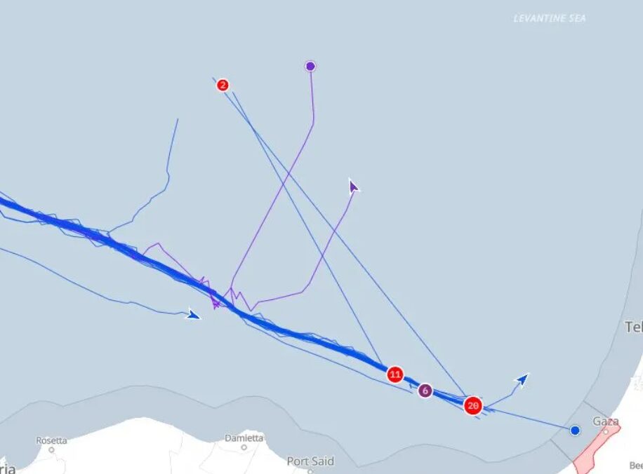 Ο live tracker δείχνει ότι ένα πλοίο του στόλου βρίσκεται σε απόσταση αναπνοής από τις ακτές της Γάζας, ενώ άλλα 23 πλοία είναι σε λειτουργία.