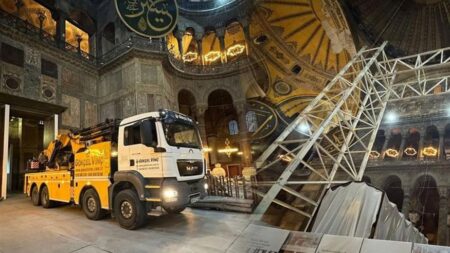 Η νέα αναστάτωση γύρω από την Αγία Σοφία πυροδοτείται από την παρουσία βαρέος μηχανικού εξοπλισμού στο εσωτερικό του μνημείου, μια εξέλιξη που εγείρει σοβαρές ανησυχίες για τον κίνδυνο φθορών και ενισχύει τους φόβους ότι η ιστορική του ακεραιότητα μπορεί να τεθεί σε άμεσο κίνδυνο.