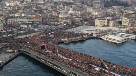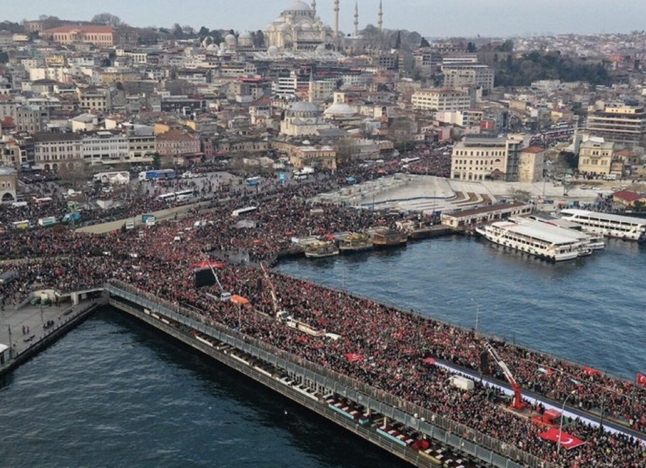 Σχεδόν μισό εκατομμύριο άνθρωποι συμμετείχαν χθες, ανήμερα της πρωτοχρονιάς, στην Κωνσταντινούπολη σε πορεία και συγκέντρωση σε ένδειξη υποστήριξης στους Παλαιστινίους στη Λωρίδα της Γάζας, ανεμίζοντας παλαιστινιακές και τουρκικές σημαίες και καλώντας να τερματιστεί η βία στον παλαιστινιακό θύλακο που έχει υποστεί πελώρια καταστροφή από τον πόλεμο.