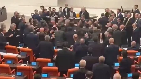 Σύμφωνα με τουρκικά μέσα ενημέρωσης, αργά το βράδυ της Κυριακής, κατά την τελευταία ημέρα των διαβουλεύσεων για τον προϋπολογισμό, ξέσπασε συμπλοκή ανάμεσα σε βουλευτές του κυβερνώντος Κόμματος Δικαιοσύνης και Ανάπτυξης (AKP) του Ρετζέπ Ταγίπ Ερντογάν και της αξιωματικής αντιπολίτευσης, του Ρεπουμπλικανικού Λαϊκού Κόμματος (CHP).