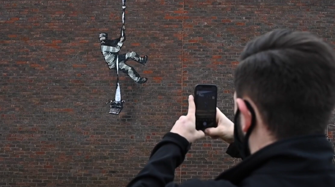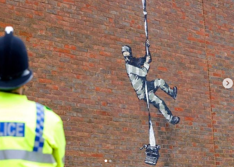 Υπενθυμίζεται ότι τον Μάρτιο, η εικόνα ενός κρατούμενου που δραπετεύει έκανε την εμφάνισή της στον εξωτερικό τοίχο των φυλακών Ρέντινγκ στο Μπέρκσαϊρ της Αγγλίας. Στην άκρη του σχοινιού μια παλιά γραφομηχανή που κρέμεται προδίδει την αναφορά στον Ιρλανδό ποιητή Όσκαρ Ουάιλντ, ο οποίος εξέτισε εκεί την ποινή του. Την κυριότητα του έργου είχε επιβεβαιώσει και ο ίδιος ο καλλιτέχνης μέσω του λογαριασμού του στο Instagram.
