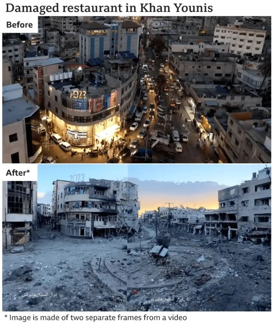 Σε όλο τον παλαιστινιακό θύλακο, συνοικίες καταστράφηκαν, πολυσύχναστοι δρόμοι με καταστήματα μετατράπηκαν σε συντρίμμια, πανεπιστήμια ισοπεδώθηκαν, καλλιέργειες ξεχερσώθηκαν, αναφέρει το BBC.