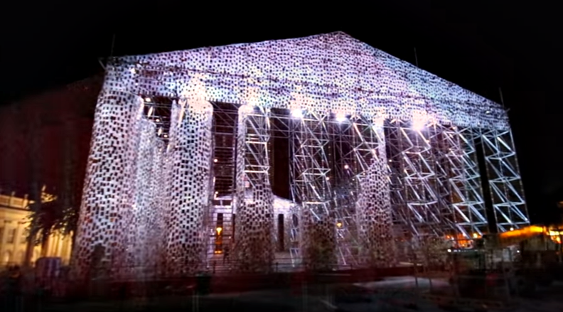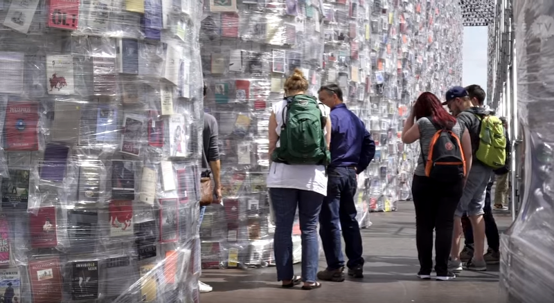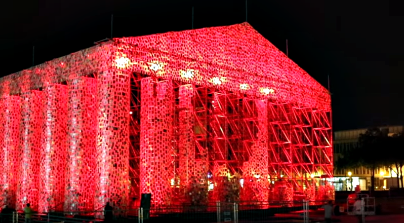 Το αντίγραφο του περίφημου ελληνικού ναού είναι «ενδεδυμένο» με 100.000 αντίτυπα 170 απαγορευμένων βιβλίων σε όλον τον κόσμο, από το 1500 μΧ ως τις ημέρες μας. Ανάμεσα σε αυτά, «Ο μικρός πρίγκιπας» του Αντουάν ντε Σεντ Εξιπερί (απαγορευμένο στην Αργεντινή), «Η Αλίκη στη χώρα των θαυμάτων» του Λιούις Κάρολ (απαγορευμένο στην Κίνα), «Οι γυμνοί και οι νεκροί» του Νόρμαν Μέιλερ (απαγορευμένο στον Καναδά).