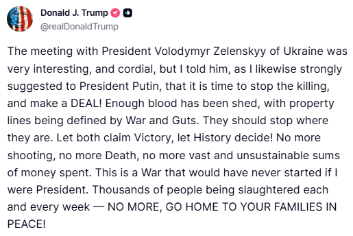 Ο Τραμπ είχε κάνει αυτή την πρόταση στις 17 Οκτωβρίου μετά από τη συνάντηση με τον Ζελένσκι με ανάρτησή του στο Truth Social.