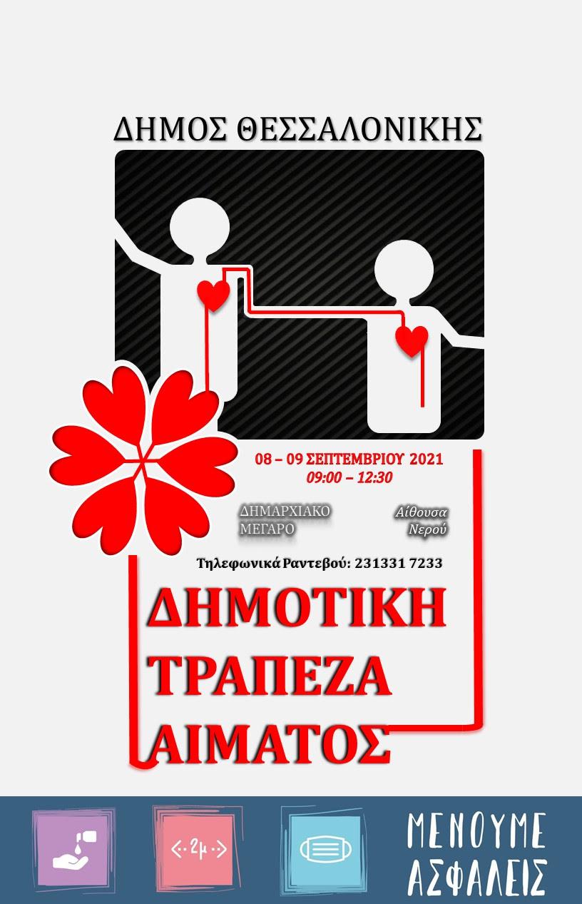 Νέα εκστρατεία εθελοντικής αιμοδοσίας οργανώνουν ο Δήμος Θεσσαλονίκης και η Δημοτική Τράπεζα Αίματος την Τετάρτη 8 και την Πέμπτη 9 Σεπτεμβρίου 2021.