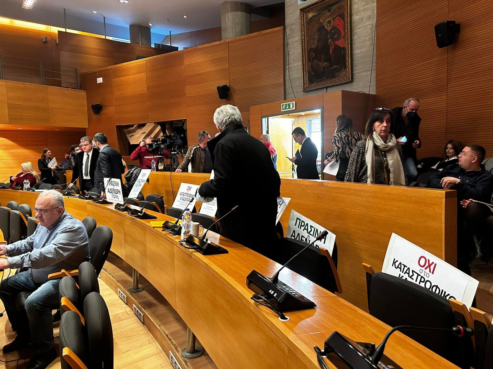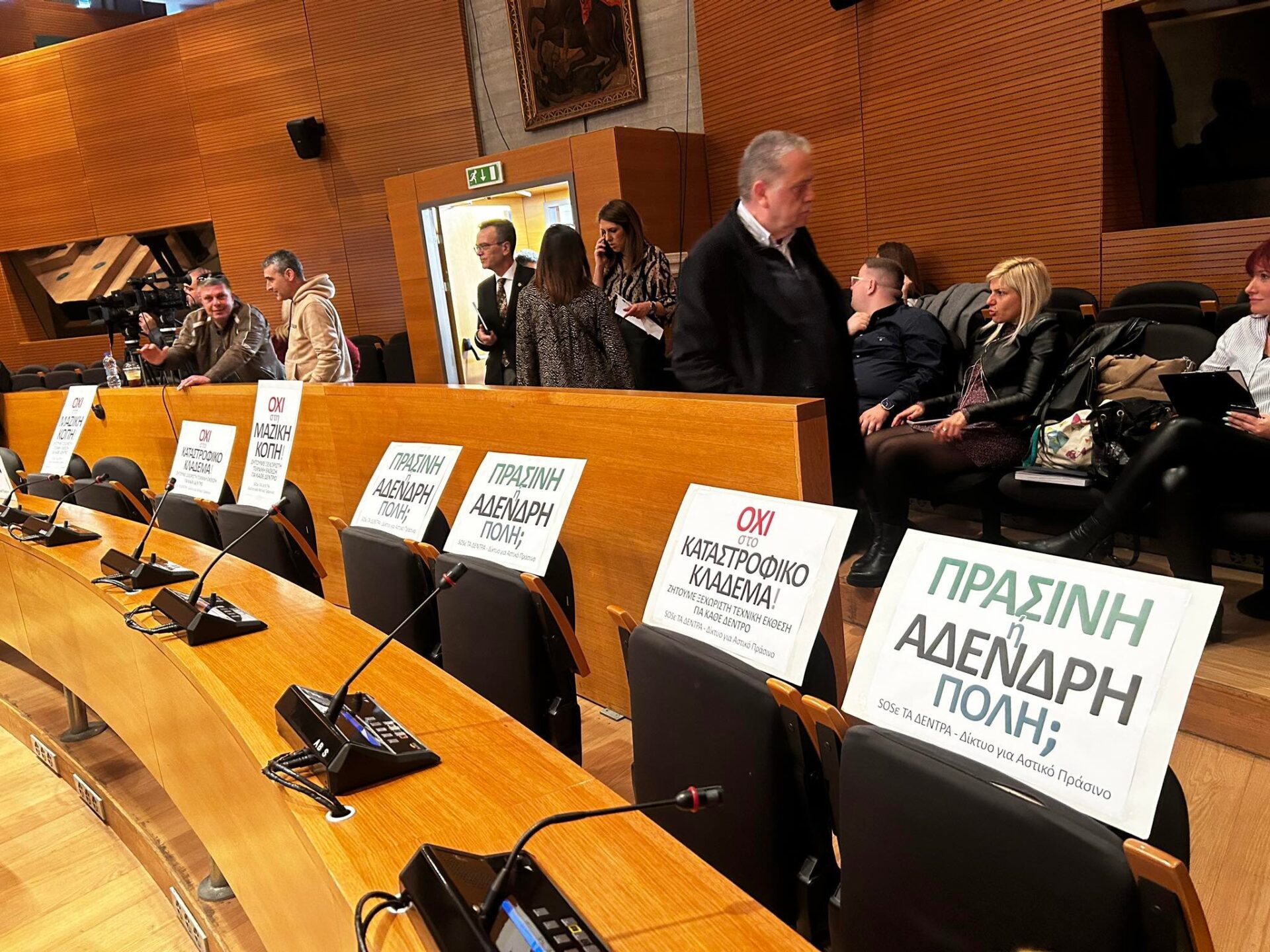 Στο μεταξύ ενόψει της σημερινής συνεδρίασης του δημοτικούς συμβουλίου, που θα ξεκινήσει σε λίγο, οι διαδηλωτές τοποθέτησαν στις καρέκλες των δημοτικών συμβούλων, μικρές αφίσες με συνθήματα υπέρ του πρασίνου και κατά των κοπών των δένδρων της πόλης. Η συνεδρίαση αναμένεται θερμή…