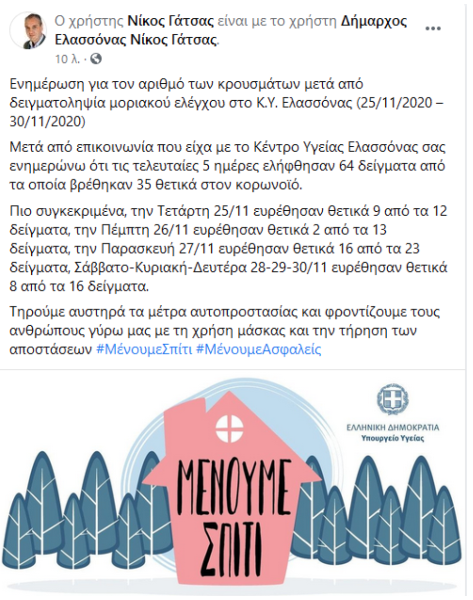 «Ενημέρωση για τον αριθμό των κρουσμάτων μετά από δειγματοληψία μοριακού ελέγχου στο Κ.Υ. Ελασσόνας (25/11/2020 – 30/11/2020) Μετά από επικοινωνία που είχα με το Κέντρο Υγείας Ελασσόνας σας ενημερώνω ότι τις τελευταίες 5 ημέρες ελήφθησαν 64 δείγματα από τα οποία βρέθηκαν 35 θετικά στον κορωνοϊό. Πιο συγκεκριμένα, την Τετάρτη 25/11 ευρέθησαν θετικά 9 από τα 12 δείγματα, την Πέμπτη 26/11 ευρέθησαν θετικά 2 από τα 13 δείγματα, την Παρασκευή 27/11 ευρέθησαν θετικά 16 από τα 23 δείγματα, Σάββατο-Κυριακή-Δευτέρα 28-29-30/11 ευρέθησαν θετικά 8 από τα 16 δείγματα. Τηρούμε αυστηρά τα μέτρα αυτοπροστασίας και φροντίζουμε τους ανθρώπους γύρω μας με τη χρήση μάσκας και την τήρηση των αποστάσεων».