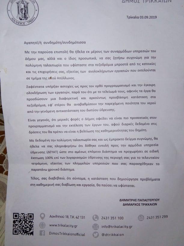 Σύμφωνα με δημοσίευμα του trikalavoice.gr μέσω της επιστολής του ο δήμαρχος εκτός της συγγνώμης του κάνει γνωστό ότι απαλλάσσονται με δική του προσωπική απόφαση (ως έκπτωση 100% των λογαριασμών τους στη ΔΕΥΑΤ) για τέσσερις μήνες επαγγελματίες και κάτοικοι της οδού ενώ “δείχνει” για την καθυστέρηση των έργων της ΔΕΥΑΤ, ασυνεννοησία μεταξύ των υπηρεσιών.