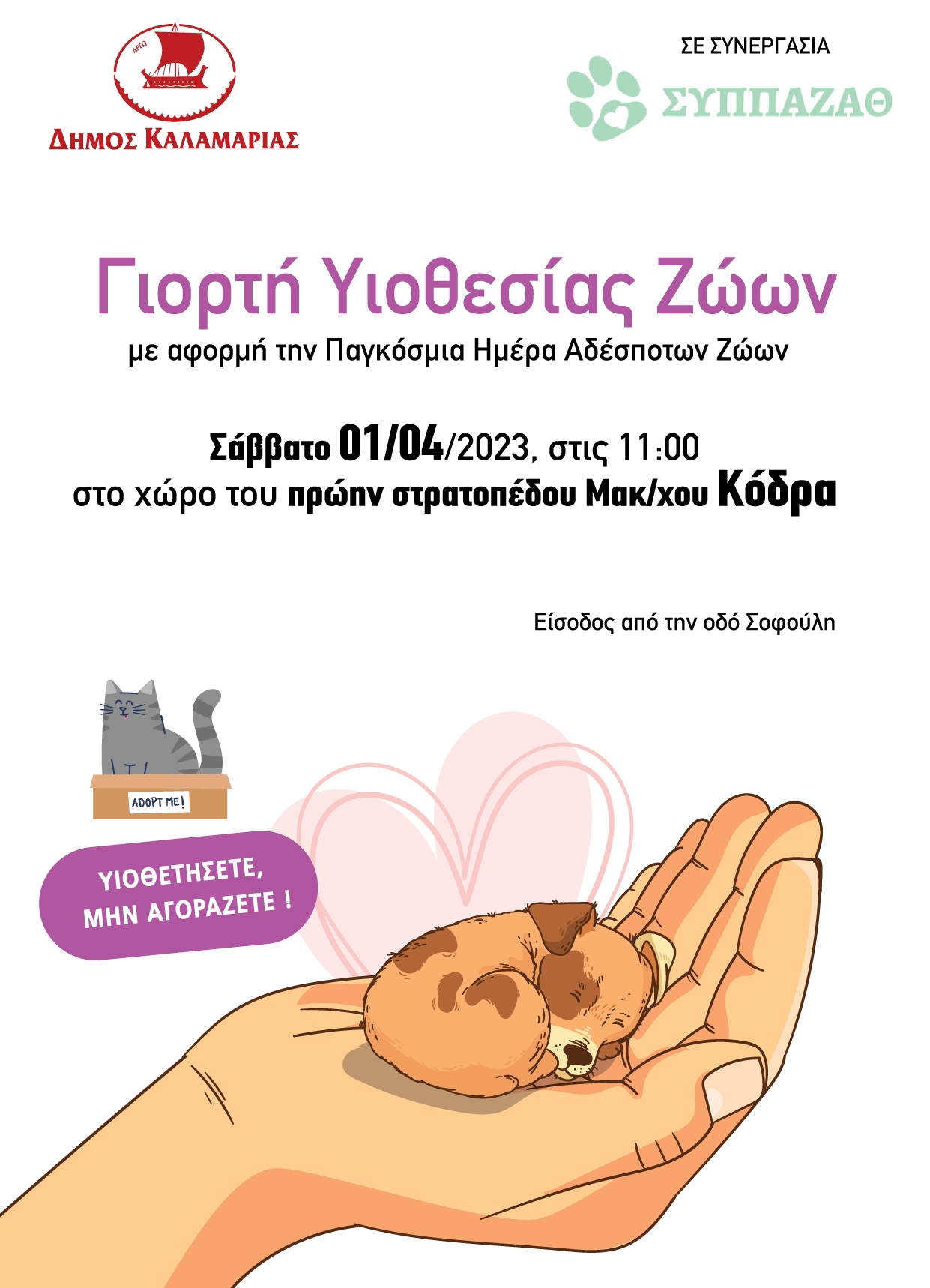 Μια γιορτή ευαισθητοποίησης και κινητοποίησης των πολιτών, για την προστασία και τη φροντίδα των αδέσποτων ζώων, οργανώνει ο Δήμος Καλαμαριάς το Σάββατο 1 Απριλίου, από τις 11:00 έως τις 13:00 στο πάρκο Κόδρα.