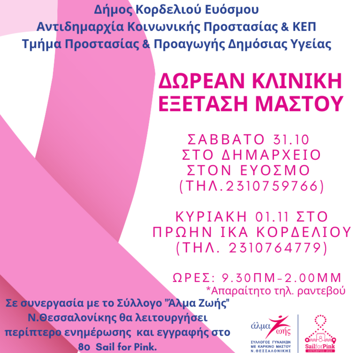 Με στόχο να μεταφέρει στις γυναίκες του Δήμου Κορδελιού Ευόσμου το μήνυμα της πρόληψης για τον καρκίνο του μαστού διοργανώνονται δωρεάν δράσεις προληπτικού κλινικού ελέγχου μαστού