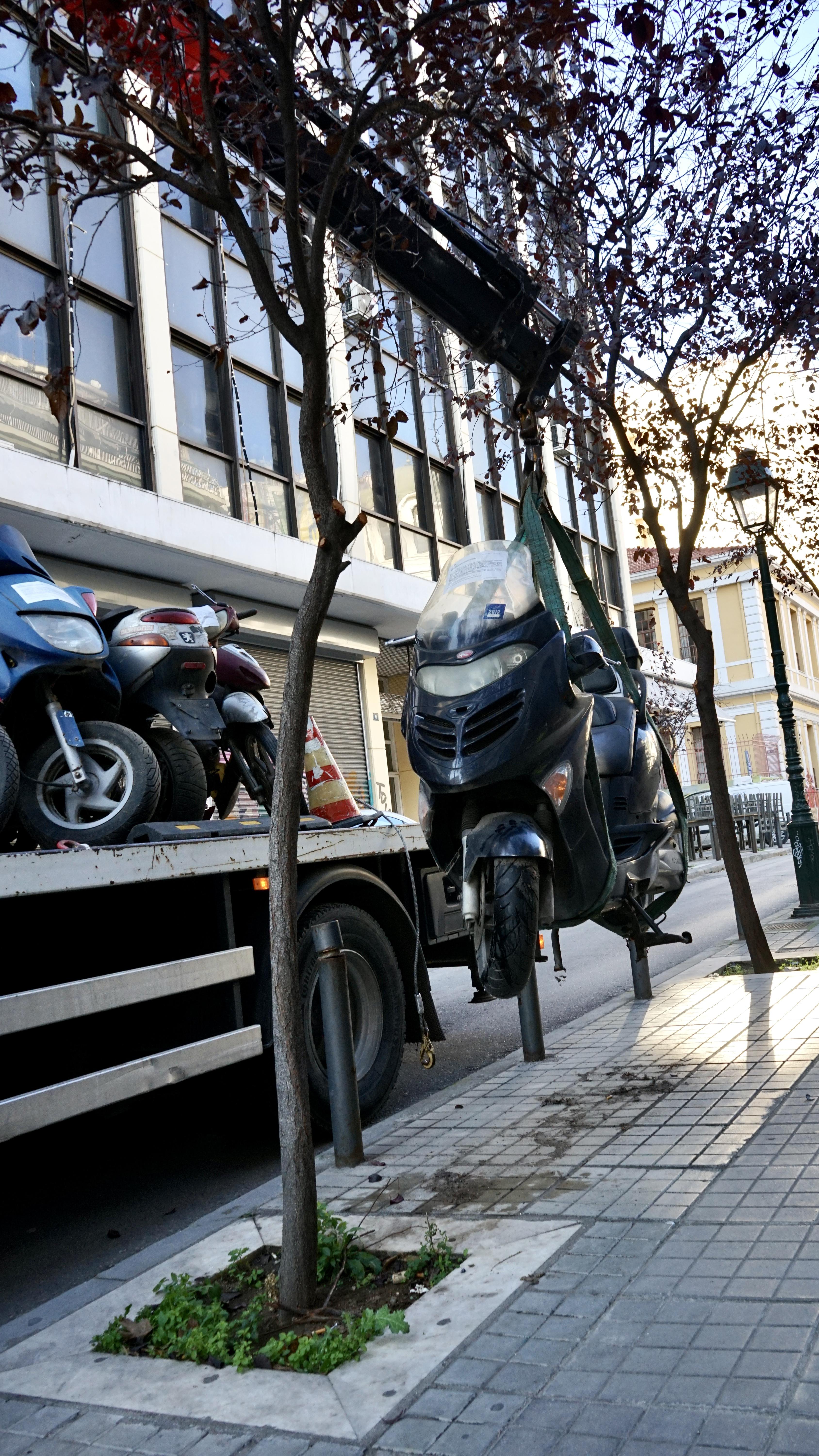 Με τη χρήση γερανοφόρου οχήματος εργαζόμενοι του τομέα καθαριότητας του Δήμου Θεσσαλονίκης απομάκρυναν σήμερα τα πρώτα δεκαπέντε δίκυκλα από διάφορα σημεία στο κέντρο της πόλης, όπως από τις οδούς Ιουστινιανού, Αγνώστου Στρατιώτου, Καραολή και Δημητρίου, Διοικητηρίου, Εθνικής Αμύνης, Μανουσογιαννάκη, Φιλικής Εταιρείας, Διαλέττη, κ.ά.