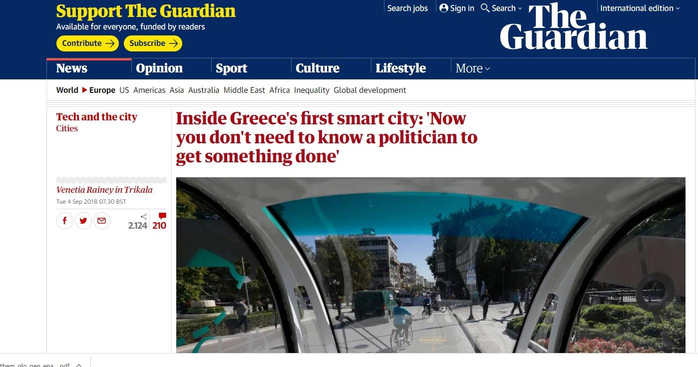 Τα Τρίκαλα και ο Δήμος Τρικκαίων ήταν θέμα των φετινών επαναληπτικών πανελλαδικών εξετάσεων των ΓΕΛ (νέο σύστημα), στις 7 Σεπτεμβρίου 2020. Πρόκειται για το μεταφρασμένο κείμενο του Guardian, της βρετανικής εφημερίδας που 2 χρόνια πριν, στις 4 Σεπτεμβρίου 2018 δημοσίευε το ρεπορτάζ της Venetia Rainey με τίτλο Inside Greece’s first smart city: ‘Now you don’t need to know a politician to get something done’