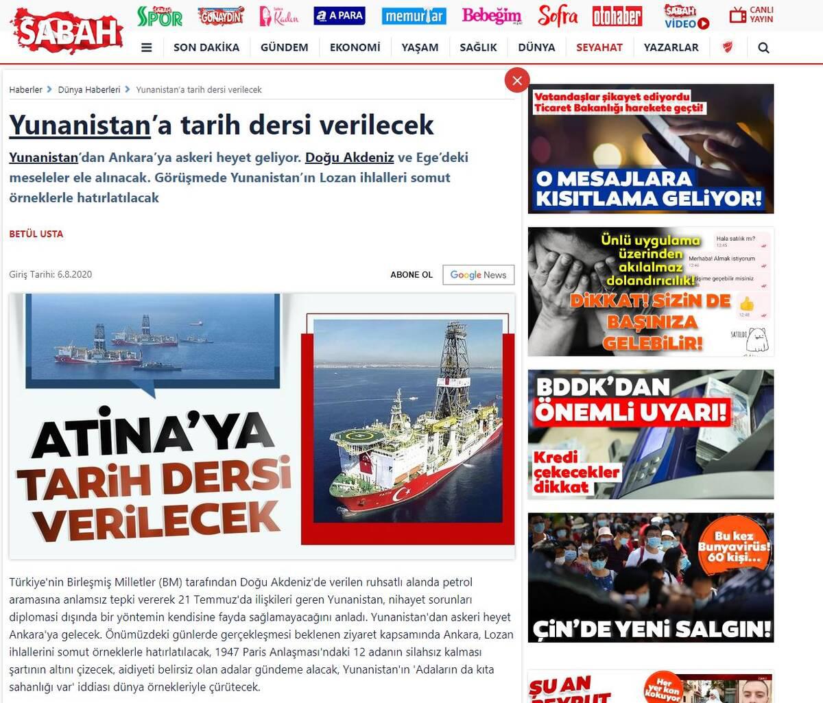 Σύμφωνα με το Κυπριακό Πρακτορείο Ειδήσεων (ΚΥΠΕ), το άρθρο της Σαμπάχ τιτλοφορείται «Μάθημα ιστορίας θα δοθεί στην Ελλάδα», και αναφέρει ότι κατά τη συνάντηση αυτή, η Τουρκία θα θέσει θέμα παραβιάσεων της Συνθήκης της Λωζάνης.