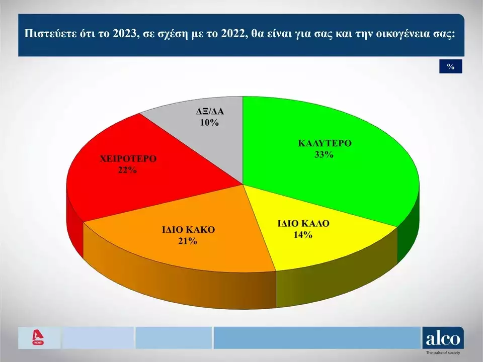 Οι πολίτες στο ερώτημα αν θεωρούν ότι το 2023 θα είναι καλύτερο για τις οικογένειες από το 2022,το 47% απάντησε πως θα είναι καλύτερα τα πράγματα ή το ίδιο καλά.