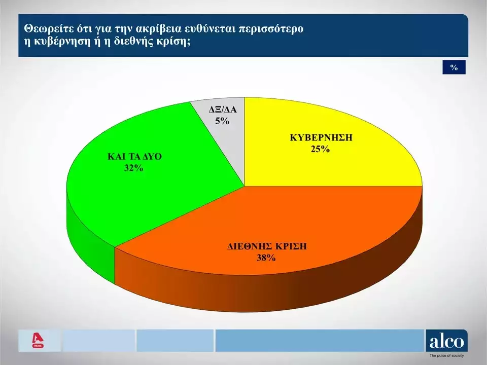 Για την ακρίβεια ευθύνεται η διεθνής κρίση λέει το 38% έναντι του 25% που απαντά η κυβέρνηση, και 32% που εκτιμά ότι ευθύνονται και τα δύο.