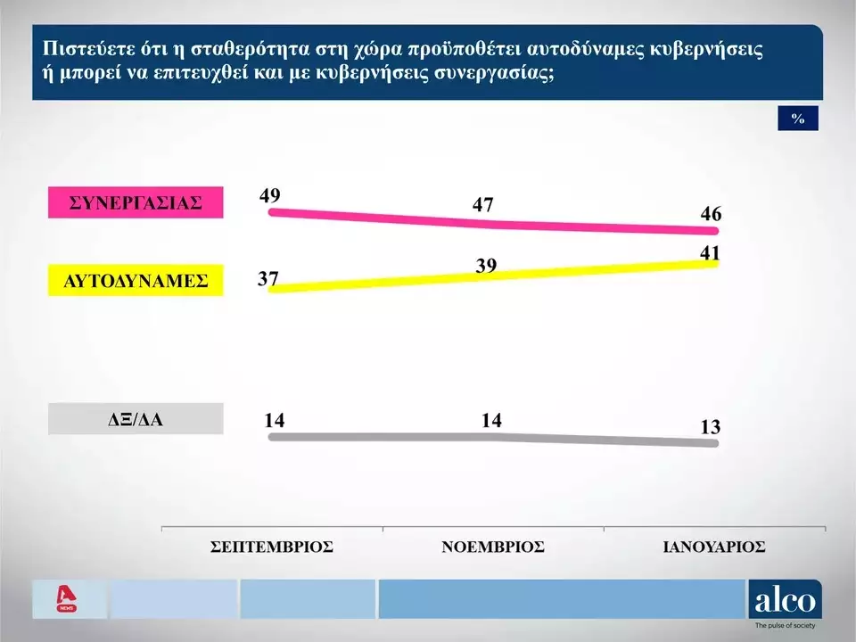 Στο δίλημμα κυβερνήσεις αυτοδυναμίας ή συνεργασίας, το 46% απάντησε υπέρ της συνεργασίας, ενώ το 41% (από 37%) τάχθηκε υπέρ της αυτοδύναμης κυβέρνησης.