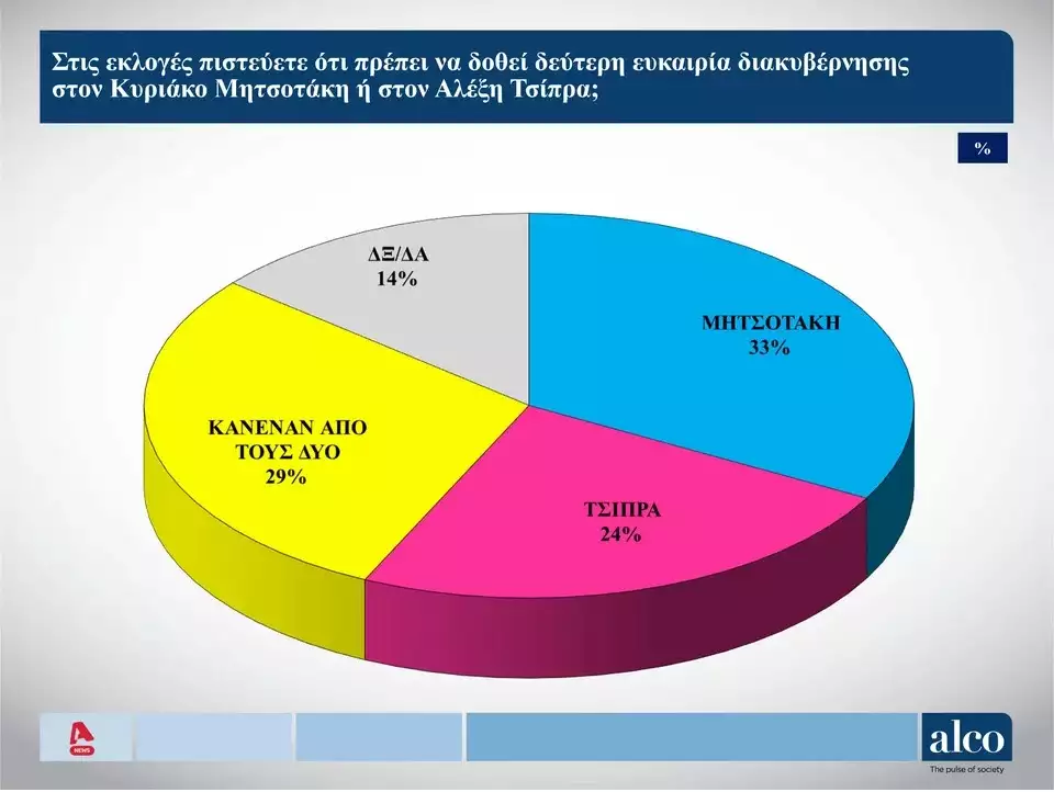 Η δημοσκόπηση της Alco διενεργήθηκε από τις 9 έως 13 Ιανουαρίου, σε πανελλαδικό δείγμα 1.002 ατόμων. Σύμφωνα με τα στοιχεία από το α’ μέρος της δημοσκόπησης, οι πολίτες έδειξαν πως θα προτιμούσαν μία δεύτερη θητεία του Κυριάκου Μητσοτάκη, έναντι του Αλέξη Τσίπρα.