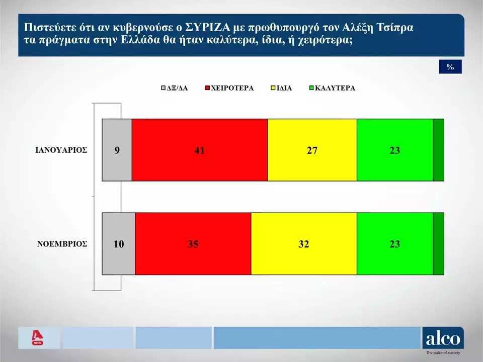 Στην ερώτηση αν τα πράγματα θα ήταν καλύτερα με ΣΥΡΙΖΑ στην κυβέρνηση, το 41% απάντησε πως θα ήταν χειρότερα, ενώ το 27% αναφέρει τα ίδια. Καλύτερα ψήφισε το 22%.