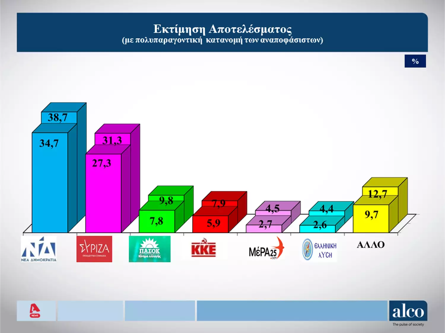 H ΝΔ θα συγκεντρώσει ποσοστό από 34,7% έως 38,7% ενώ ο ΣΥΡΙΖΑ εκτιμάται ότι θα συγκεντρώσει από 27,3% έως 31,3%