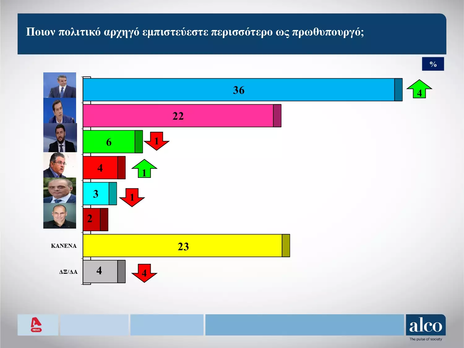 Κυριάκος Μητσοτάκης 36% Αλέξης Τσίπρας 22% Νίκος Ανδρουλάκης 6% Δημήτρης Κουτσούμπας 4% Κυριάκος Βελόπουλος 3% Γιάννης Βαρουφάκης 2% Κανένας 23% ΔΞ/ΔΑ 4%