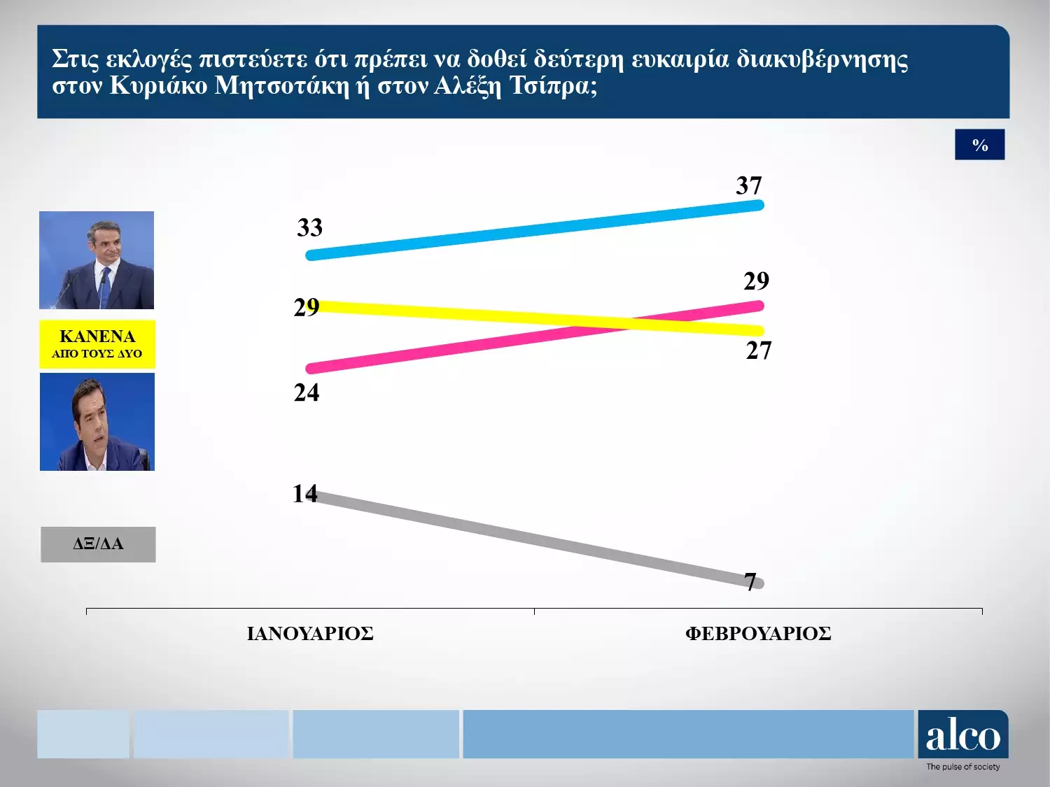 Δημοσκόπηση Alco: Στο 7% το προβάδισμα της ΝΔ από ΣΥΡΙΖΑ – Εμπιστοσύνη σε Μητσοτάκη