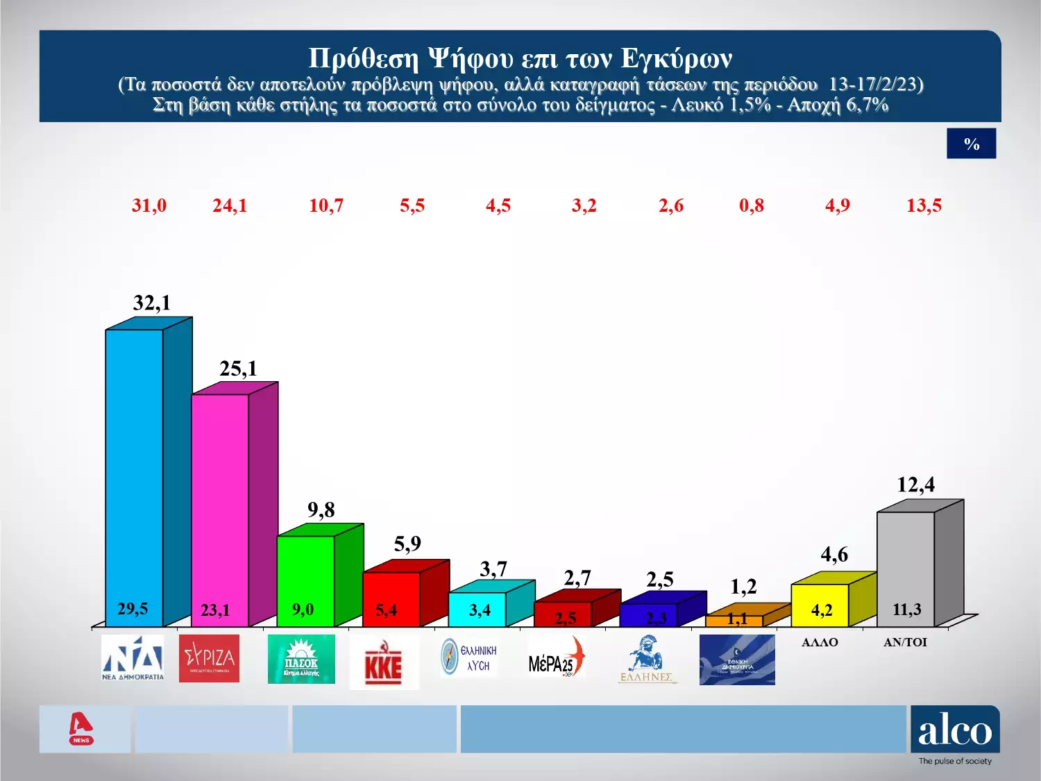 Στο 7% είναι το προβάδισμα της Νέας Δημοκρατίας από τον ΣΥΡΙΖΑ, σύμφωνα με τη δημοσκόπηση που διενήργησε η εταιρεία Alco για τον ALPHA, το διάστημα 13 – 17 Φεβρουαρίου 2023, σε πανελλαδικό δείγμα 1001 ατόμων.