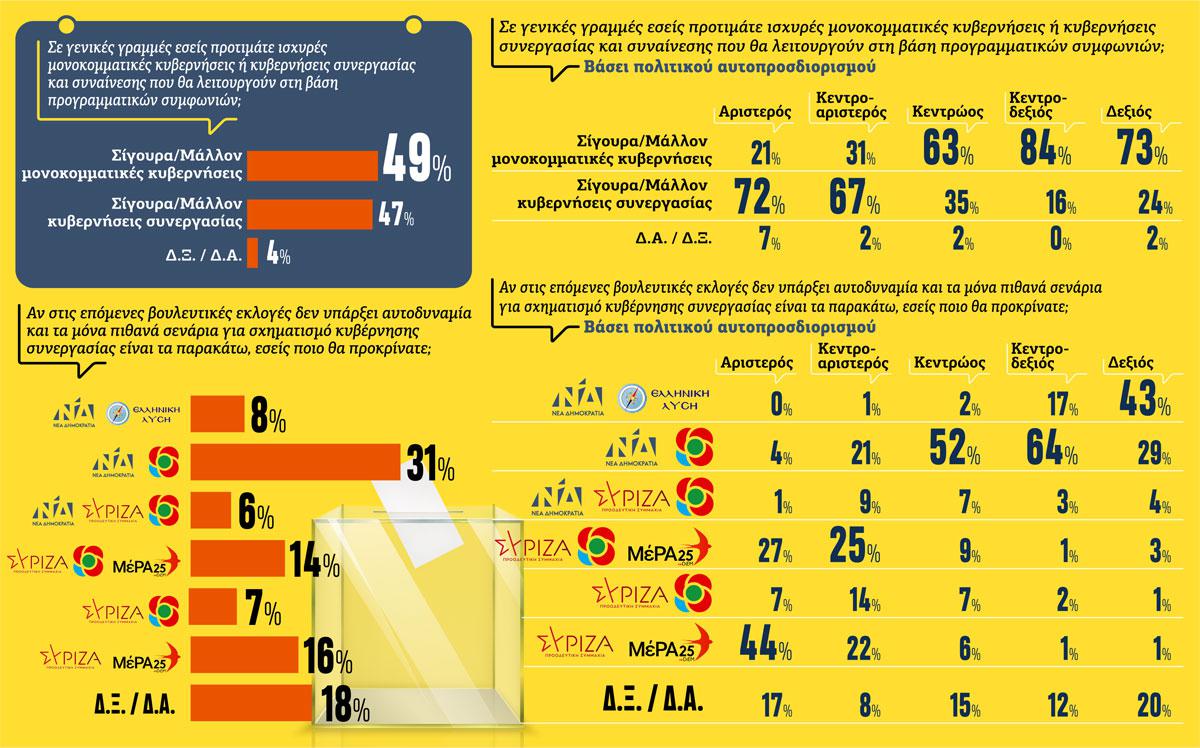 Πιο ειδικά, στο ερώτημα, «σε γενικές γραμμές εσείς προτιμάτε ισχυρές μονοκομματικές κυβερνήσεις ή κυβερνήσεις συνεργασίας και συναίνεσης που θα λειτουργούν στη βάση προγραμματικών συμφωνιών», οι απαντήσεις δείχνουν ότι οι πολίτες είναι διχασμένοι ανάμεσα στις δύο επιλογές, αφού το 49% υποστηρίζει ότι προκρίνει μονοκομματικές, ενώ το 47% συνεργατικά σχήματα. Βάσει πολιτικού αυτοπροσδιορισμού των ερωτηθέντων, όσοι δηλώνουν κεντροδεξιοί και δεξιοί, προτιμούν σε υψηλά ποσοστά (84% και 73%) κυβερνήσεις ενός κόμματος, ενώ αντίθετα οι αριστεροί και κεντροαριστεροί (72% και 67% αντίστοιχα) κυβερνήσεις προγραμματικής συνεργασίας.