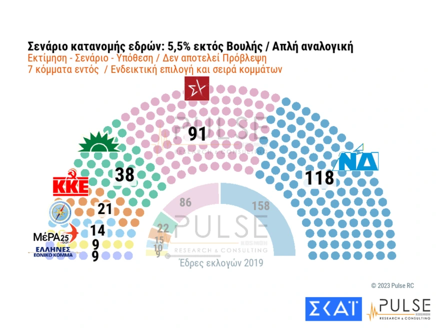 Το δεύτερο μέρος της μεγάλης δημοσκόπησης της Pulse για τις επικείμενες εκλογές παρουσίασε σήμερα το κεντρικό δελτίο ειδήσεων του ΣΚΑΪ και εκεί φάνηκε η κατανομή εδρών των κομμάτων που μπορεί να προκύψει μέσω της απλής αναλογικής. Επίσης, αναλύθηκαν και όλα τα σενάρια αν δεν προκύψει κυβέρνηση στις δυο εκλογικές αναμετρήσεις.