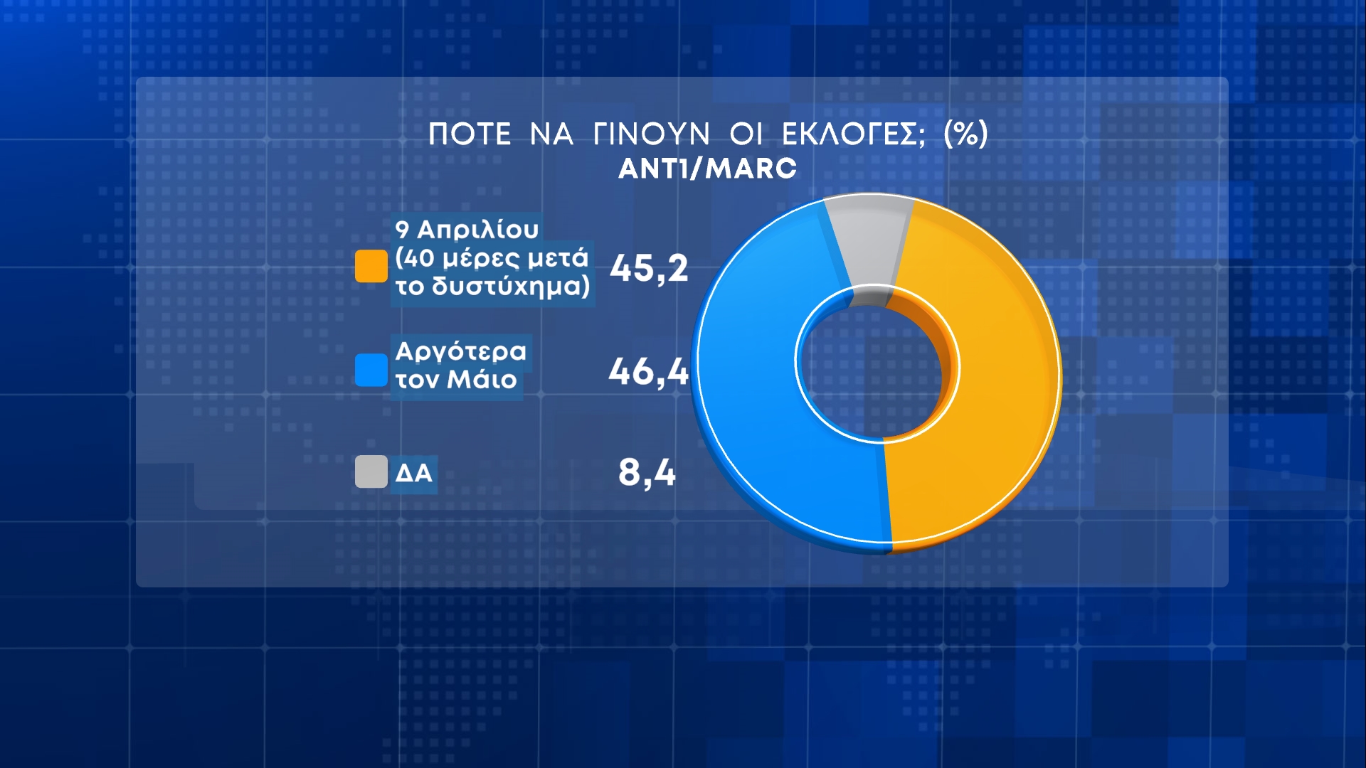 Αναφορικά με το πότε θα πρέπει να γίνουν οι εκλογές το 46,4% λέει αργότερα τον Μάιο ενώ το 45,2% στις 9 Απριλίου.