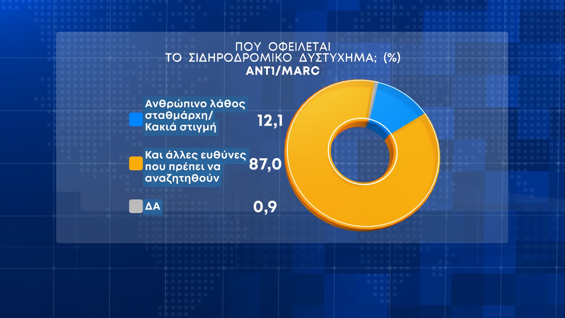 Στην ερώτηση για το που πιστεύει ο κόσμος ότι οφείλεται το σιδηροδρομικό δυστύχημα στα Τέμπη, μόλις το 12,1% απαντά σε «ανθρώπινο λάθος/κακιά στιγμή» με το 87,0% να λέει «και άλλες ευθύνες που πρέπει να αναζητηθούν».