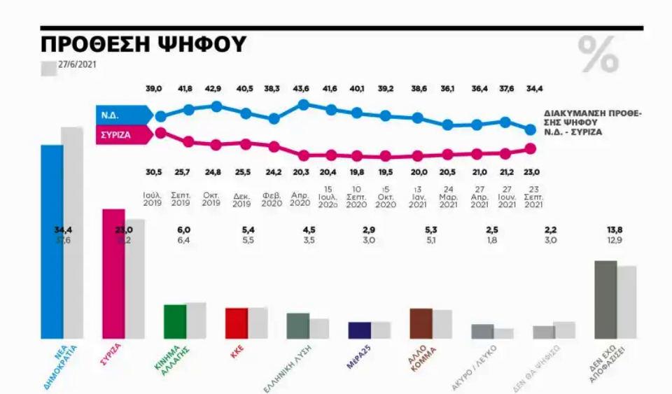 Στην πρόθεση ψήφου η ΝΔ συγκεντρώνει το 34,4% (έναντι 37,6% τον Ιούνιο), με τον ΣΥΡΙΖΑ να κερδίζει σχεδόν δύο ποσοστιαίες μονάδες και να φτάνει στο 23% (από 21,2%). Ακολουθούν το ΚΙΝΑΛ με 6%, το ΚΚΕ με 5,4%, η Ελληνική Λύση με 4,5%, ενώ το ΜέΡΑ25 καταγράφει ποσοστό 2,9% και μένει οριακά εκτός Βουλής.