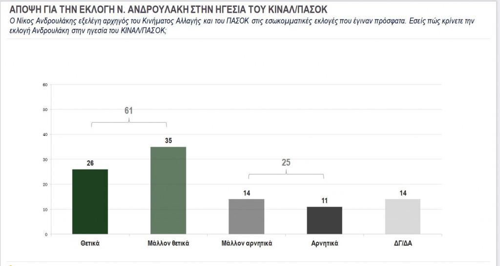 Σχετικά με την άποψη του δείγματος για την εκλογή του Νίκου Ανδρουλάκη στην ηγεσία του ΚΙΝΑΛ, το 26% απαντά “θετικά”, το 35% “μάλλον θετικά”, το 14% “μάλλον αρνητικά”, το 11% “αρνητικά”. Σύμφωνα με τη δημοσκόπηση το 75% από τη ΝΔ απαντά πως κρίνει θετική ή μάλλον θετική” την εκλογή, από το ΣΥΡΙΖΑ το ποσοστό αυτό είναι στο 43% , στο ΚΙΝΑΛ 77%, στο ΚΚΕ 53%, στη Ελληνική Λύση 67% και 53% στο Μερα25.