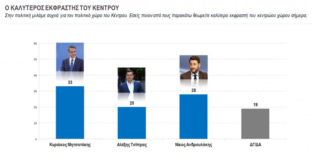 Στο επίκεντρο της δημοσκόπησης μπαίνει η μάχη του λεγόμενου κέντρου μετά και της εκλογές στο ΚΙΝΑΛ όπου στο ερώτημα της ΚΑΠΑ “Εσείς ποιον από τους παρακάτω θεωρείτε καλύτερο εκφραστή του κεντρώου χώρου σήμερα;” το 33% απαντά τον πρωθυπουργό και πρόεδρο της ΝΔ Κυριάκο Μητσοτάκη, το 28% τον πρόεδρο του ΚΙΝΑΛ Νίκο Ανδρουλάκη και το 20% τον πρόεδρο του ΣΥΡΙΖΑ Αλέξη Τσίπρα. Το 68% της δεξαμενής της ΝΔ απαντά ως προς τον “καλύτερο εκφραστή του κεντρώου χώρου σήμερα” τον Κυριάκο Μητσοτάκη, ενώ ο Αλέξης Τσίπρα υποχωρεί στο 3% και ο Νίκος Ανδρουλάκης στο 17%. Από την δεξαμενή του ΣΥΡΙΖΑ ο Αλέξης Τσίπρας ως καταλληλότερος συγκεντρώνει 50%, ο Κυριάκος Μητσοτάκης 9% και ο Νίκος Ανδρουλάκης 23%. Από το ΚΙΝΑΛ ο Νίκος Ανδρουλάκης συγκεντρώνει ποσοστό 73%, ο Αλέξης Τσίπρας 6% και ο Κυριάκος Μητσοτάκης 9%.