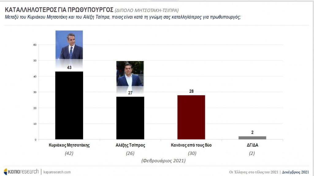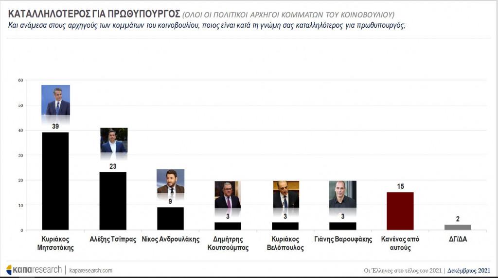 Παρά την εκλογή του Νίκου Ανδρουλάκη στη αρχηγία του ΚΙΝΑΛ φαίνεται πως παραμένει το δίπολο Κυριάκος Μητσοτάκης και Αλέξης Τσίπρας με ποσοστά 39% και 23% αντίστοιχα, ενώ ο κ. Ανδρουλάκης συγκεντρώνει 9%. Από 3% συγκεντρώνουν ο πρόεδρος του ΚΚΕ Δημήτρης Κουτσούμπας 3%, ο πρόεδρος της Ελληνικής Λύσης Κυριάκος Βελόπουλος και ο Γιάννης Βαρουφάκης. Ο “Κανένας” συγκεντρώνει το ποσοστό του 15%. Στο ερώτημα της Καπα “μεταξύ του Κυριάκου Μητσοτάκη και του Αλέξη Τσίπρα, ποιος είναι κατά τη γνώμη σας καταλληλότερος για πρωθυπουργός;” τα ποσοστά είναι στο 42% για τον Κυριάκο Μητσοτάκη και 26% για τον Αλέξη Τσίπρα, όπου ο “Κανένας” συγκεντρώνει 30%.