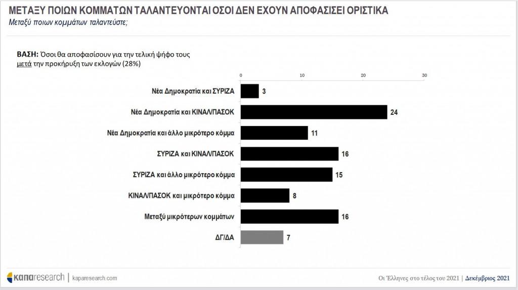 Ενδιαφέροντα είναι τα ευρήματα σχετικά με τους αναποφάσιστους ψηφοφόρους και αφορά όσους θα αποφασίσουν για την τελική ψήφο τους μετά την προκήρυξη των εκλογών (28%). Στο ερώτημα μεταξύ “ποιων κομμάτων ταλαντεύεται;” το μεγαλυτερο ποσοστό 24% ταλαντεύεται μεταξύ Νέα Δημοκρατία και ΚΙΝΑΛ και το 16% μεταξύ ΣΥΡΙΖΑ και ΚΙΝΑΛ. Μόλις το 3% απαντά μεταξύ “Νέα Δημοκρατία και ΣΥΡΙΖΑ”.