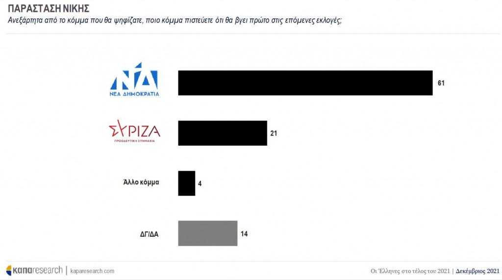Στην παράσταση νίκης και στο ερώτημα “ανεξάρτητα από το κόμμα που θα ψηφίζατε, ποιο κόμμα πιστεύετε ότι θα βγει πρώτο στις επόμενες εκλογές;” το 61% απαντά ΝΔ, 21% ΣΥΡΙΖΑ και 4% άλλο κόμμα.